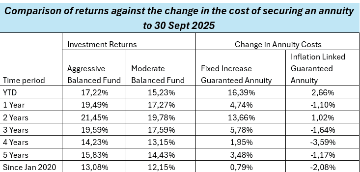 This table illustrates that the cost of securing a guaranteed annuity (together with inflation over that period) has increased by 4.74% over the last year to 30 September 2025. Investment returns over this time were between 17.27% and 19.49% depending on whether you were invested in an aggressive or moderate balanced portfolio.