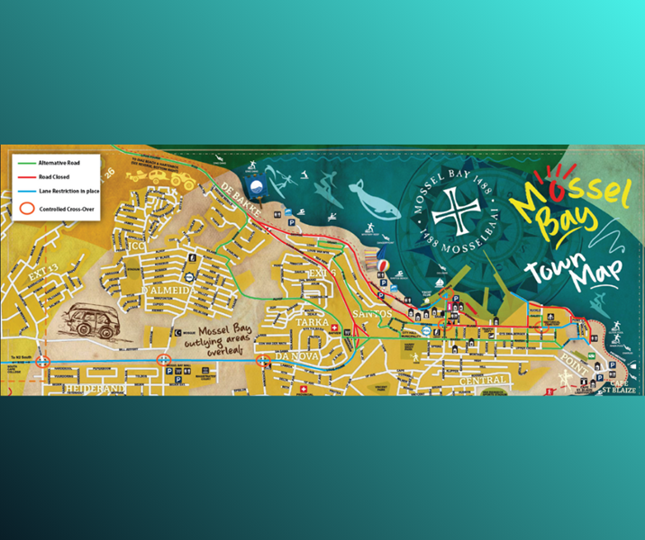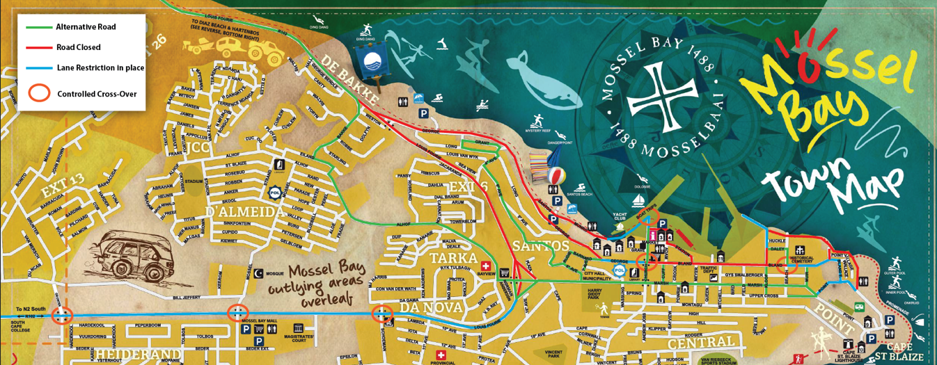 One lane reserved for residents to exit via the Port of Mossel Bay between 04:00 and 08:45. Vehicles will only be able to return after 16:30. Patrons to Santos Beach, Santos Express and Jackal on the Beach can park off site and walk via Munro Beach.