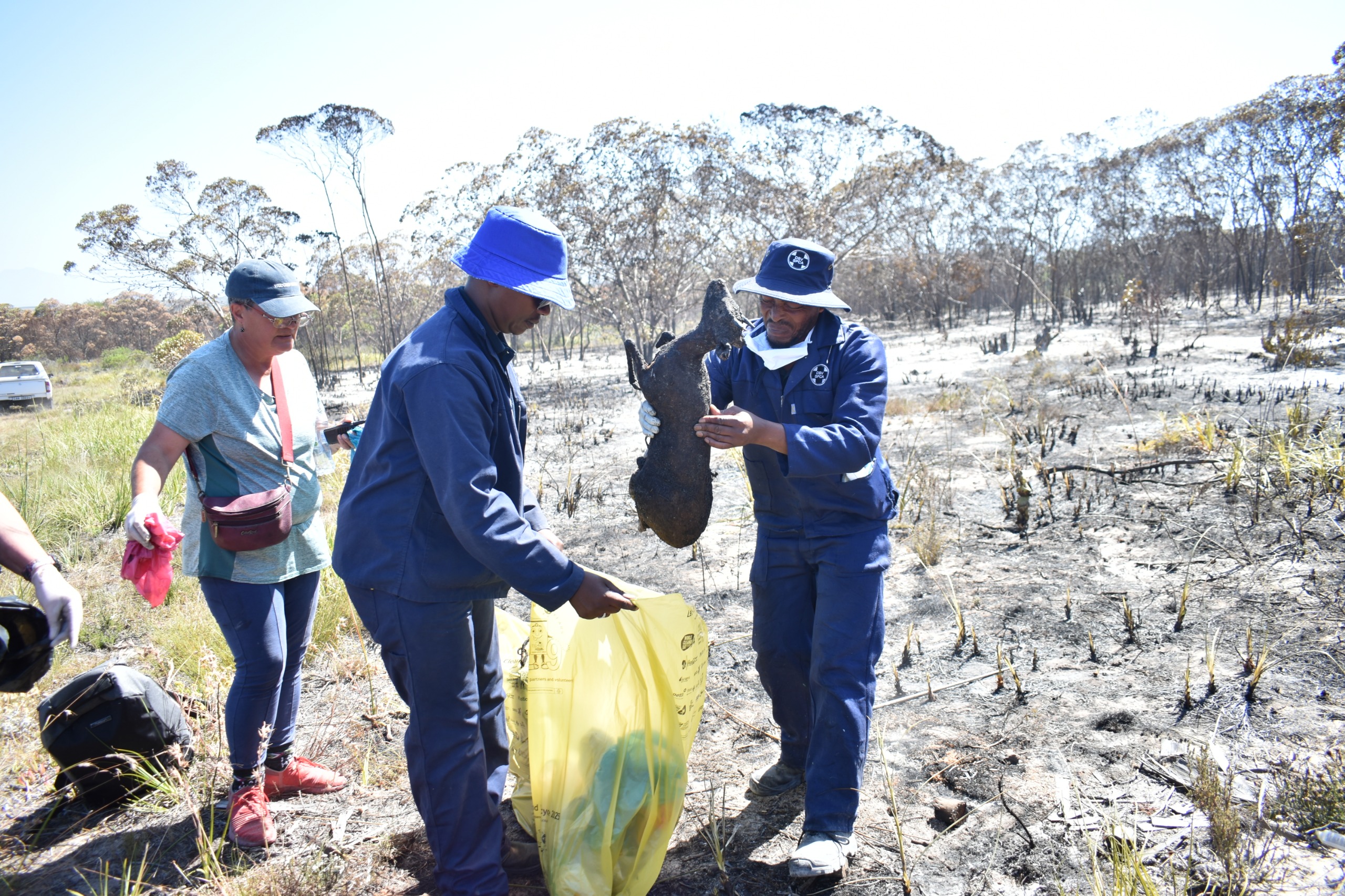 Dana Bay Conservancy's Erika Van der Westhuizen looks on while two members of the Garden Route SPCA Mossel Bay branch, Vuyo Klaasen and Johannes Mathobisa, bag a dead antelope that was caught in the Dana Bay wildfires.