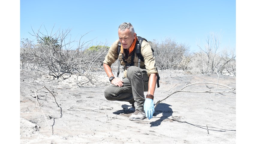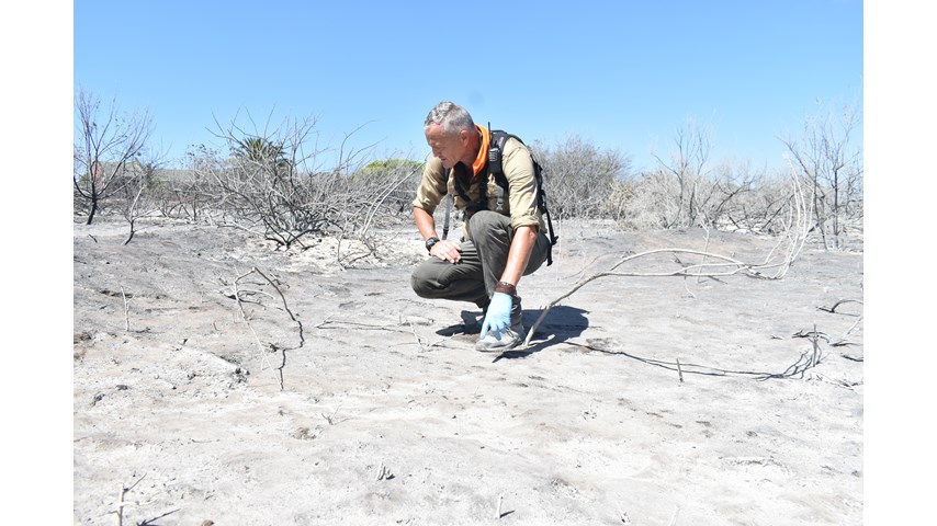 Leon Rossouw of the WCIN examines a set of tracks left by an animal that survived the wildfires. Photo: Chelsea Pieterse