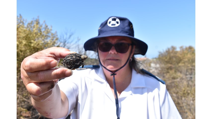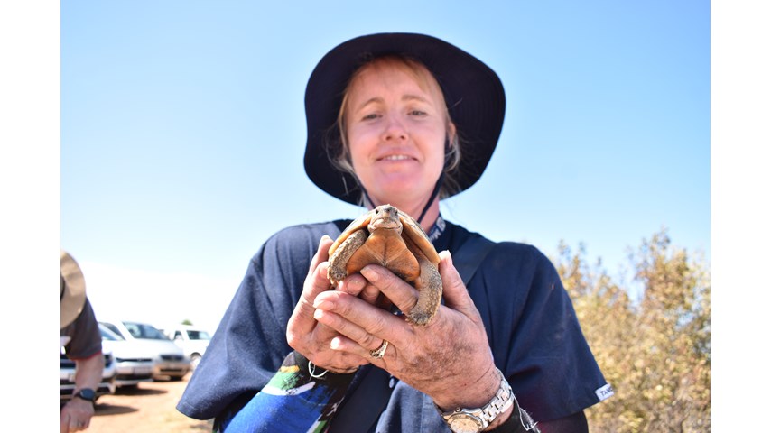 Kay Ievers of the Garden Route SPCA Mossel Bay branch holds up a surviving tortoise she rescued during the operation. Photo: Chelsea Pieterse