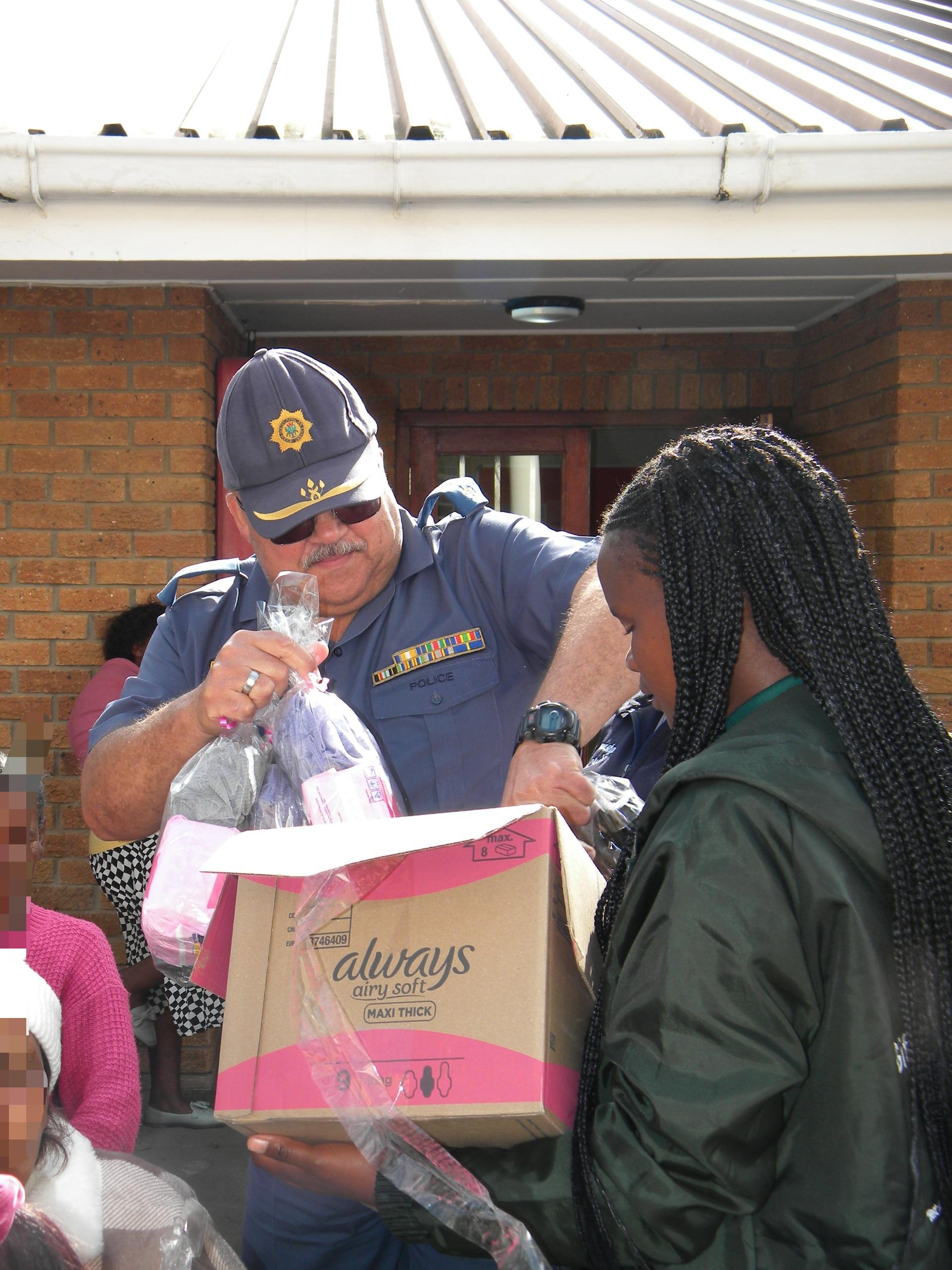 Acting Station Commander of the Da Gamaskop Police Station, Lieutenant Colonel Edy Williams distributing sanitary pads donated by Gift of the Givers. Photo: Gabriélla Siebritz