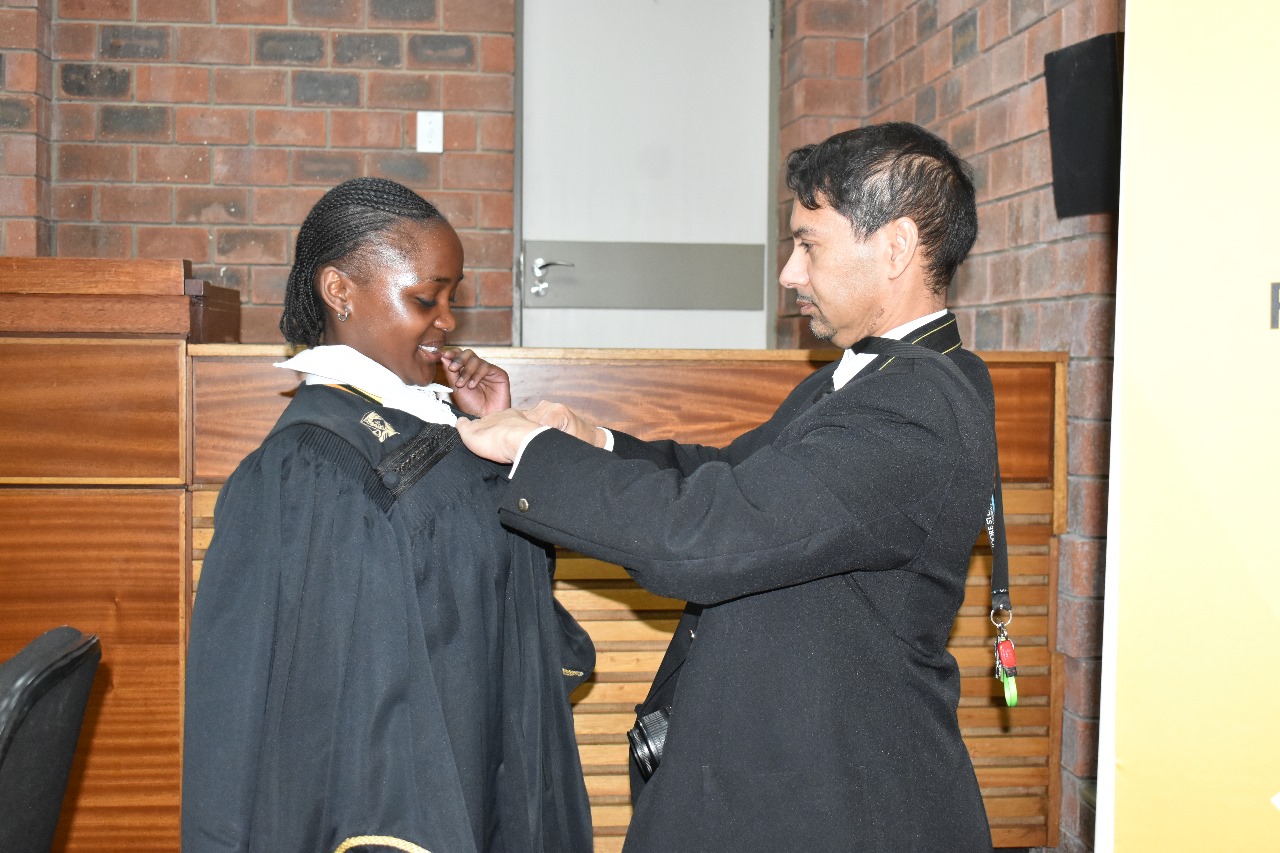 Amyoli Shweni gets ready for her role as prosecutor in the mock trial, with assistance from Mossel Bay District Court Prosecutor Craig Merrington. Photo: Chelsea Pieterse