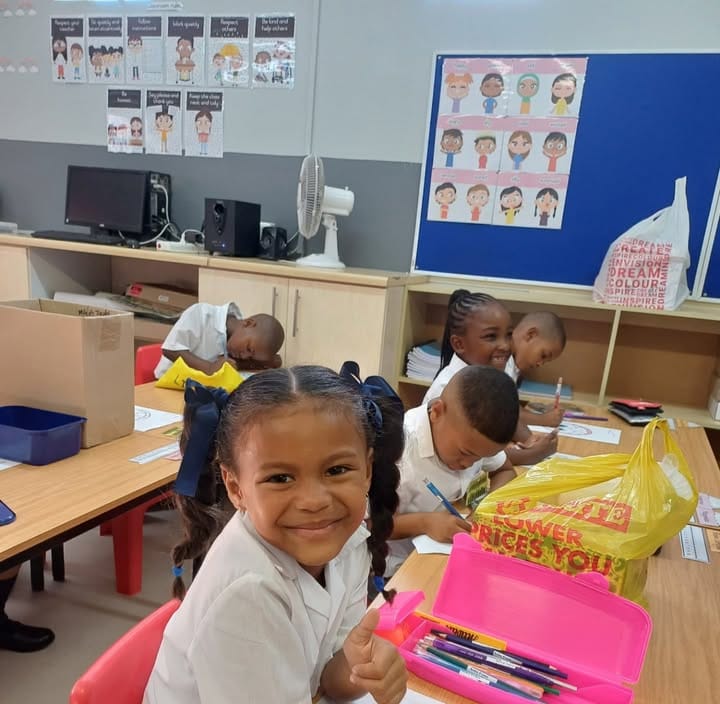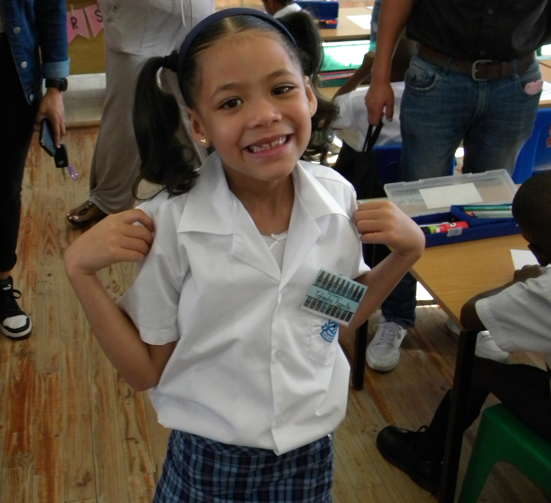 While some learners were shy, one little girl, Tahesha Appollis, confidently posed for photographs, before turning to speak to her teacher, Tehillah Scheepers.