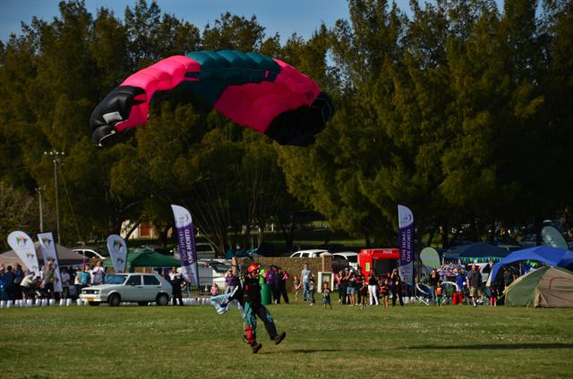 Een van die hoogtepunte van die Cansa Relay for Life byeenkoms hierdie jaar was die valskermspringer wat tot groot opwinding aanleiding gegee het toe op die terrein geland is. Foto: Elaine van der Toorn
