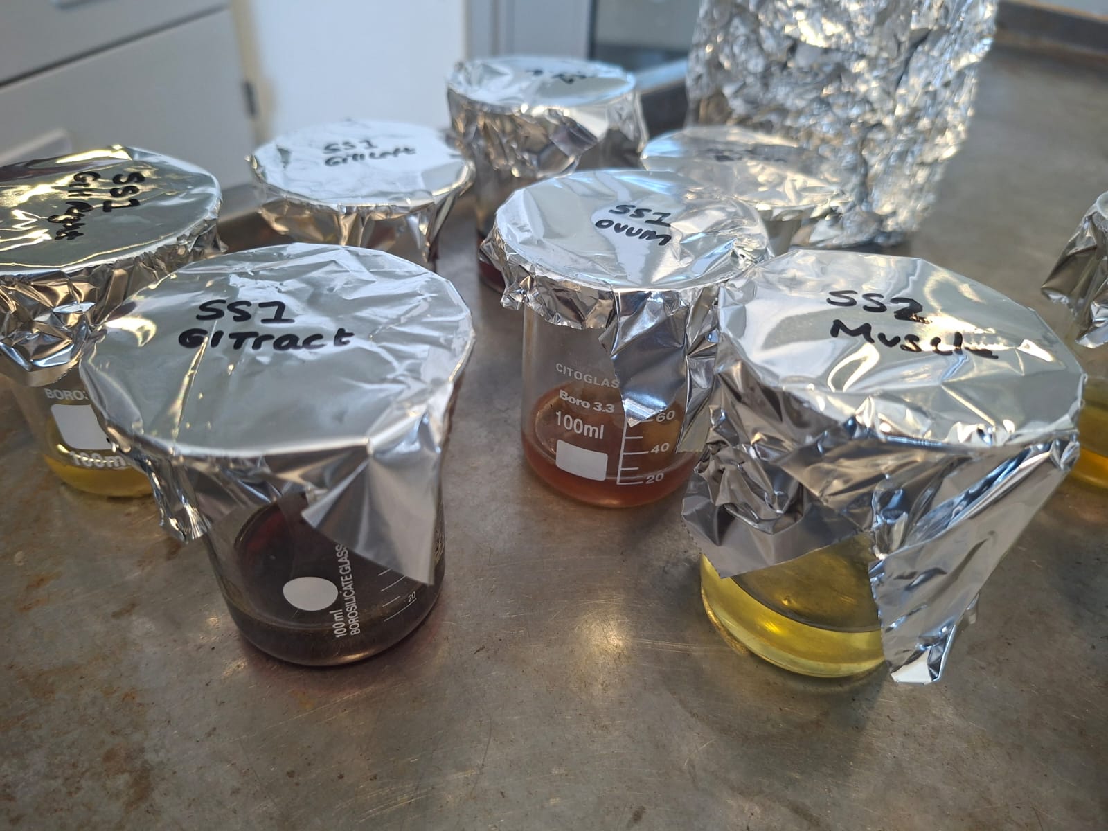 Verwerkte marinemonsters, insluitend spysverteringskanale en spierweefsel, word verteer en gefiltreer om die teenwoordige mikroplastiek te kwantifiseer en te identifiseer.