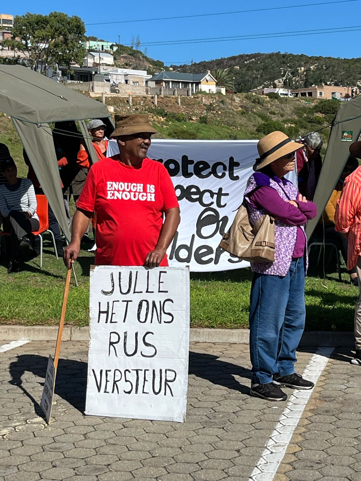 A member of the unhappy group, calling for protection of the elderly and demanding that seven residents are not evicted. Photo: Gabriélla Siebritz