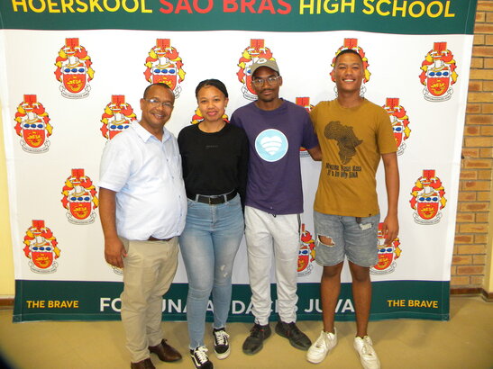 Sao Bras High School's principal, Henry Willemse, and the school's top three matric learners, Shanique Bruinders, Luchen Moolman and Tyricq Uithaler. Photo: Gabriélla Siebritz