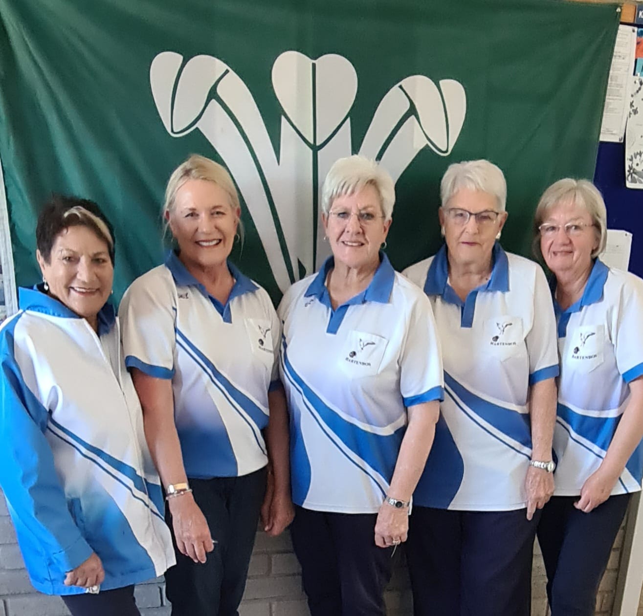 Hartenbos Rolbalklub het ook 'n tweede plek in die Derde Liga behaal. Hier is Mariana Maritz, Linda Klein, Sue Stockwell, Rita Nell en Heleen Holl.