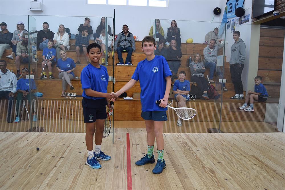 Tournament winner Giovanni Pieterson (13) shake hands with Arnoux Rossouw (13) after a nail-biting match at the Mossel Bay Squash Courts.